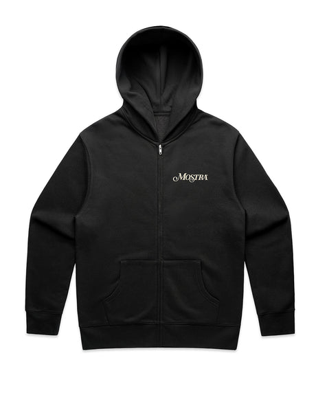 This black Zip hoodie is part of Mostra's core apparel collection. It features a zip hood, drop shoulder, kangaroo pocket, lined hood, no drawcord, and sleeve cuff ribbing. It is made from quality materials.